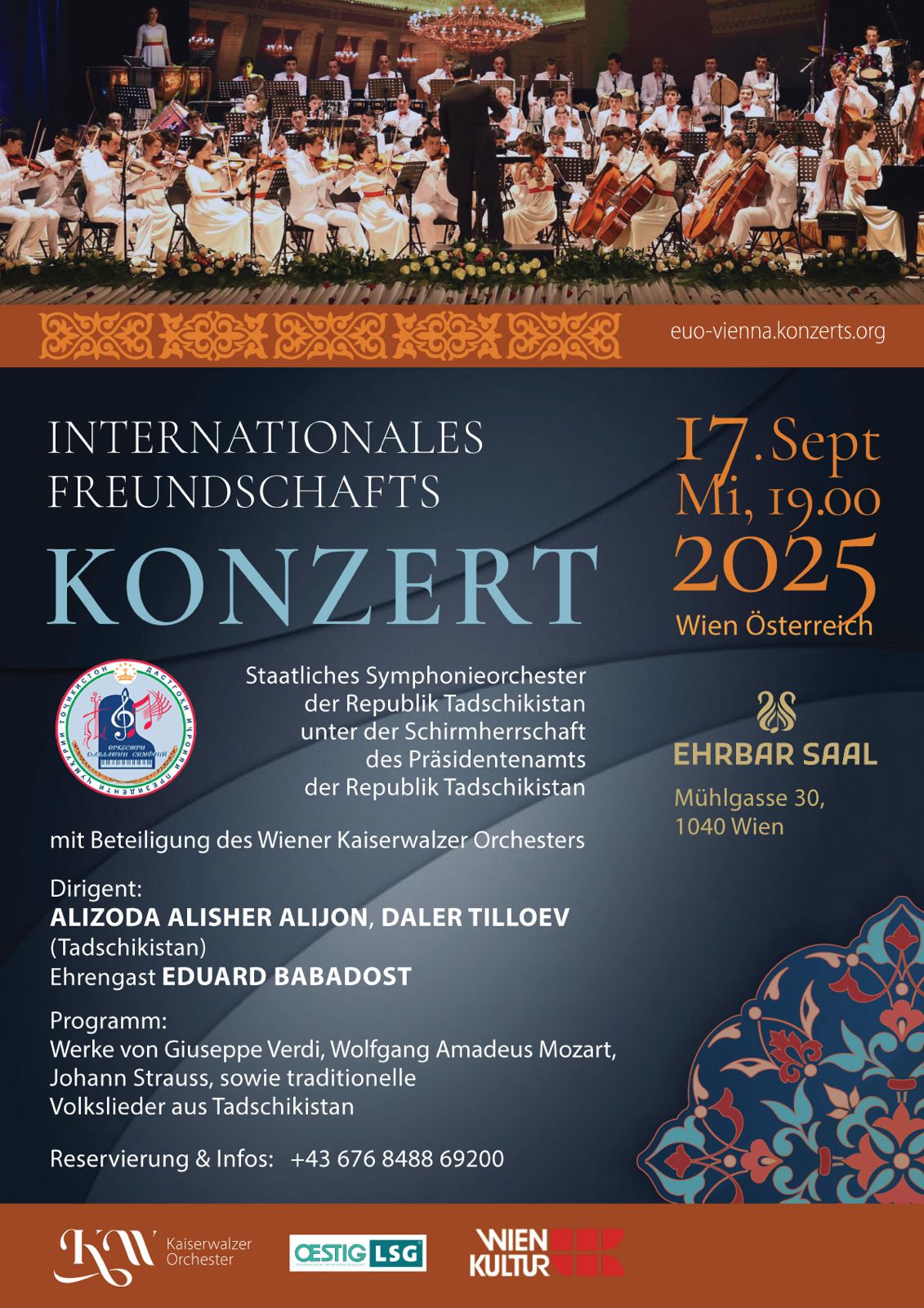 - 17.09.2025 – Internationales Freundschaftskonzert mit dem Staatlichen Symphonieorchester der Republik Tadschikistan und dem Kaiserwalzer Orchester, Ehrbar Saal, 1040 Wien